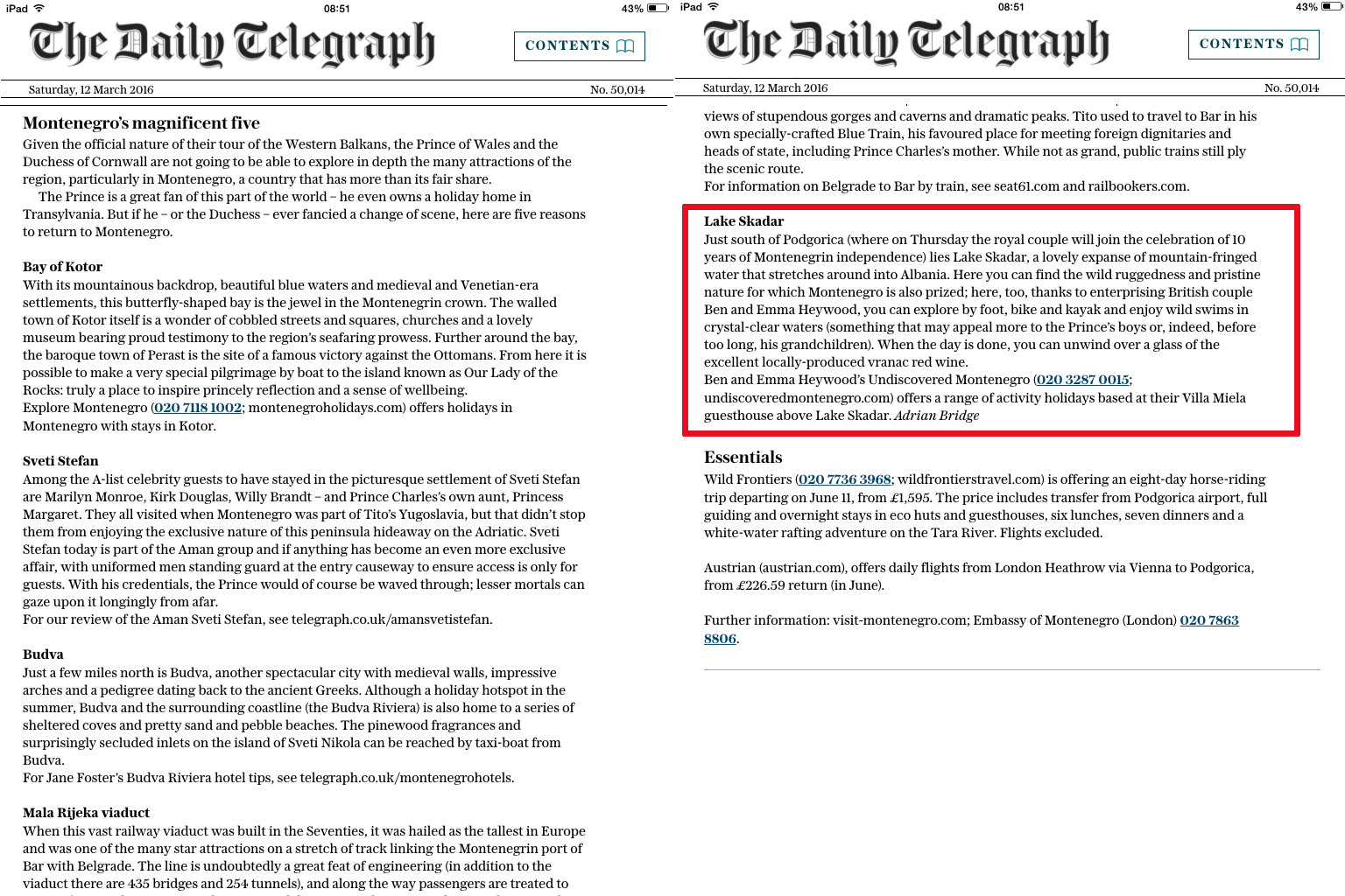 Undiscovered Montenegro and our Lake Skadar agency get a recommendation from National Geographic Traveller!